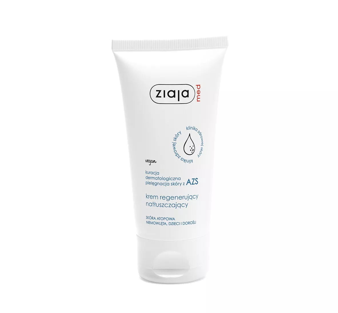 Ziaja Med Kuracja dermatologiczna-skóra z AZS to specjalistyczny krem regenerujący i natłuszczający, stworzony z myślą o skórze atopowej, suchej i skłonnej do podrażnień. Jego receptura, zawierająca 93% składników pochodzenia naturalnego, skutecznie wspiera regenerację naskórka i łagodzi objawy AZS. Produkt jest odpowiedni dla niemowląt, dzieci oraz dorosłych, co czyni go idealnym wyborem dla całej rodziny.