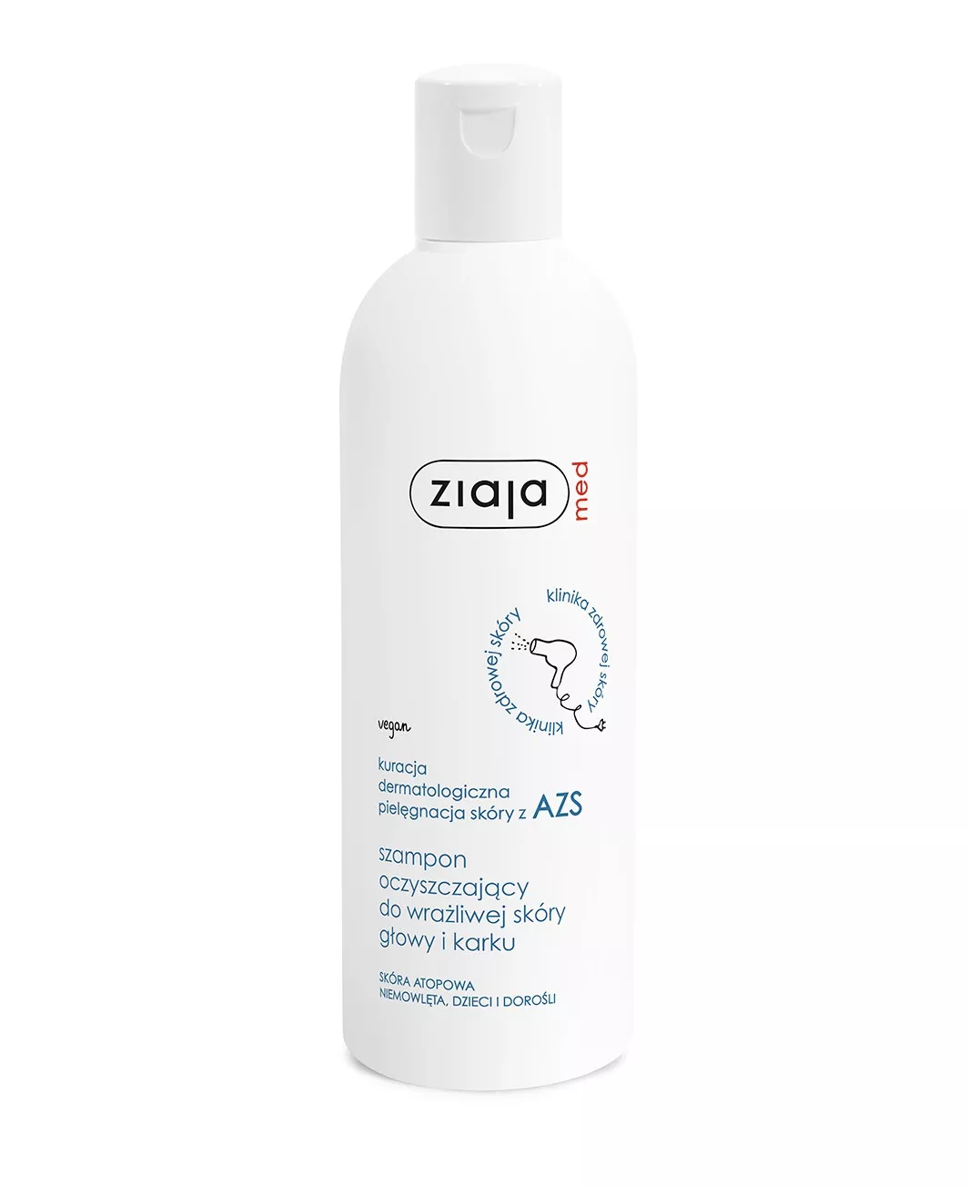 Ziaja Med Kuracja dermatologiczna-skóra z AZS to specjalistyczny szampon oczyszczający, stworzony z myślą o wrażliwej skórze głowy i karku, szczególnie dla osób z atopowym zapaleniem skóry (AZS). Produkt jest częścią linii, która obejmuje 7 różnych kosmetyków do pielęgnacji twarzy, ciała, włosów oraz dłoni, odpowiednich dla dorosłych i niemowląt. Formuła oparta na niezbędnych składnikach naśladuje naturalny płaszcz hydro-lipidowy skóry, co pomaga wydłużyć okres bezobjawowy atopii. Szampon zawiera zmiękczające emolienty oraz substancje nawilżające, które skutecznie łagodzą nadwrażliwość na czynniki zewnętrzne, podrażnienia, zaczerwienienia, swędzenie, pieczenie, suchość i szorstkość skóry.