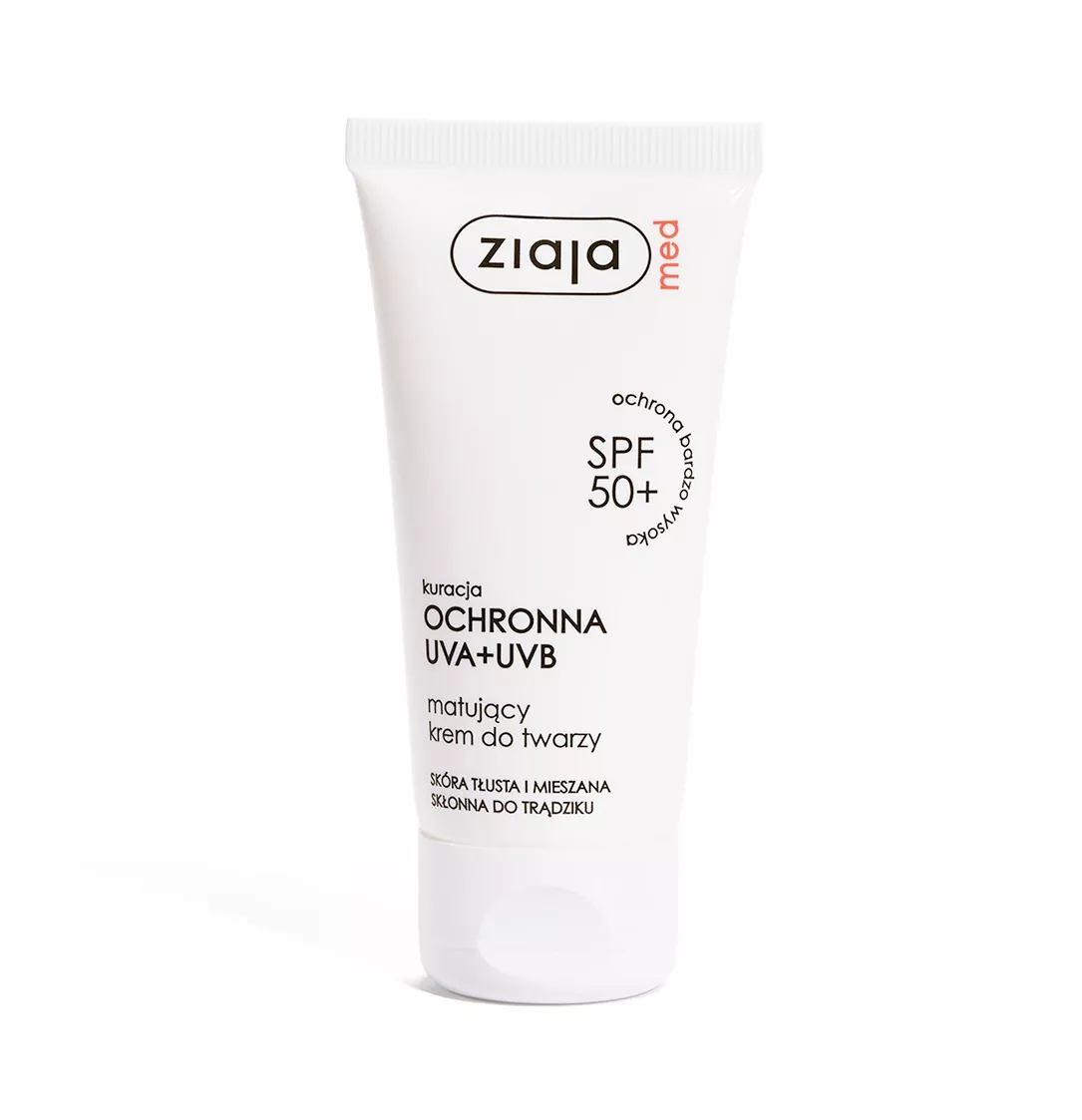 Kuracja ochronna Ziaja Med SPF 50+ to matujący krem do twarzy, który oferuje bardzo wysoką ochronę przed promieniowaniem UVA i UVB. Produkt został stworzony z myślą o wymagającej skórze, szczególnie tłustej, mieszanej oraz skłonnej do trądziku. Dzięki nowoczesnym, fotostabilnym filtrom, skutecznie zabezpiecza skórę przed podrażnieniami, przebarwieniami i uszkodzeniami słonecznymi. Idealny dla osób narażonych na ekstremalne nasłonecznienie, na przykład podczas uprawiania sportu na zewnątrz.
