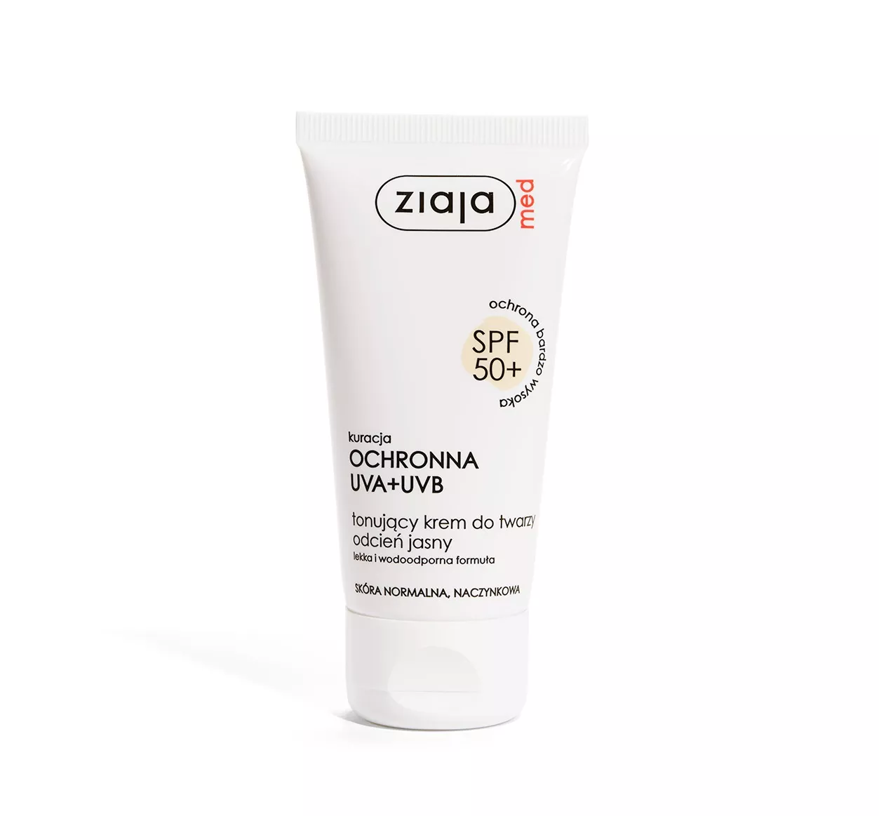 Ziaja Med Kuracja ochronna SPF 50+ to tonujący krem do twarzy w odcieniu jasnym, który zapewnia bardzo wysoką ochronę przed promieniowaniem UVA i UVB. Doskonały dla osób narażonych na ekstremalne nasłonecznienie, chroni skórę przed powstawaniem przebarwień i zabezpiecza zmiany barwnikowe takie jak znamiona i pieprzyki. Lekka, wodoodporna formuła skutecznie wyrównuje koloryt i kryje niedoskonałości, jednocześnie nawilżając skórę dzięki fotostabilnym filtrom nowej generacji.