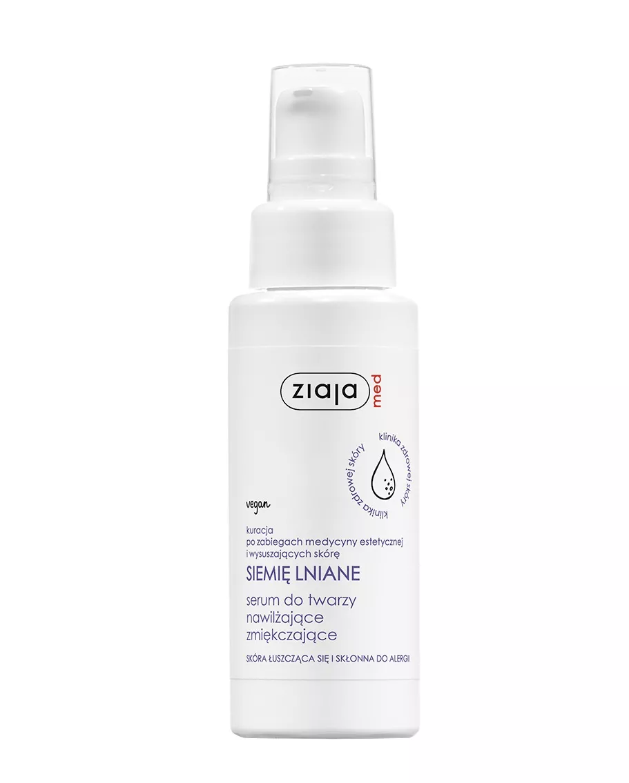 Serum do twarzy Ziaja Med Kuracja siemieniem lnianym to produkt z serii dermokosmetyków, stworzony na bazie certyfikowanego hydrolizatu z siemienia lnianego. Idealne dla osób z wrażliwą skórą oraz po zabiegach medycyny estetycznej. Oferuje ultranawilżającą i łagodną pielęgnację, potwierdzoną badaniami dermatologicznymi na skórze dysfunkcyjnej.