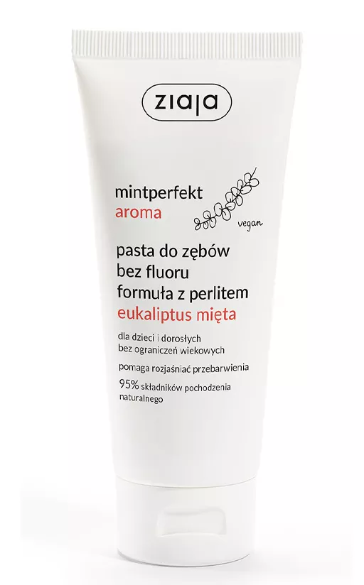 Ziaja Mintperfekt Aroma to nowoczesna pasta do zębów bez fluoru, stworzona z myślą o delikatnej, ale skutecznej higienie jamy ustnej. Pasta opiera się na mineralnych składnikach takich jak krzemionki, węglan wapnia, biała glinka i perlit, które łagodnie oczyszczają zęby bez ryzyka ścierania szkliwa. Wzbogacona w ziołowe aromaty z naturalnych olejków mięty, limonki, werbeny, eukaliptusa oraz zielonej herbaty, pasta zapewnia świeży i przyjemny oddech. Jest bezglutenowa i odpowiednia dla wegan.
