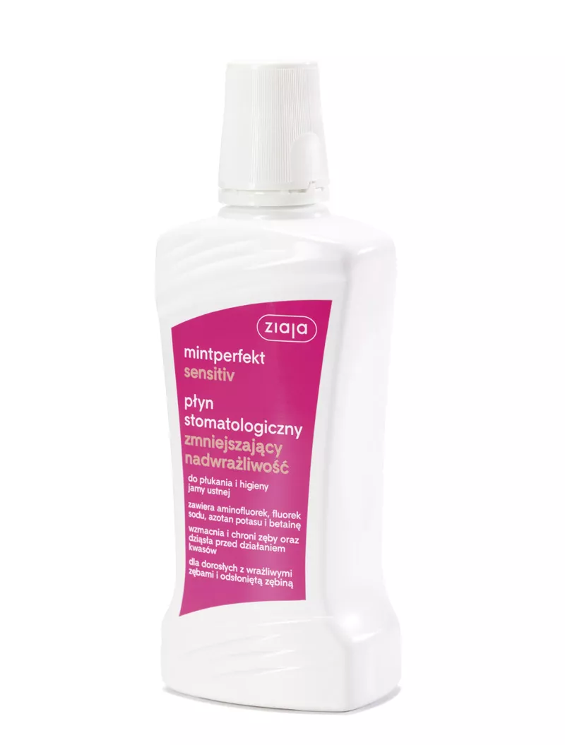 Płyn do płukania jamy ustnej Ziaja Mintperfekt Sensitiv to specjalistyczny produkt, który skutecznie zmniejsza nadwrażliwość zębów. Stworzony bez użycia alkoholu, zawiera naturalną betainę, azotan potasu, aminofluorek oraz fluorek sodu, co wspiera redukcję nadwrażliwości. Produkt wzmacnia szkliwo, chroni dziąsła oraz odsłonięte szyjki zębowe, a także zapobiega odkładaniu się bakteryjnej płytki nazębnej. Zawiera 0,025% fluoru.